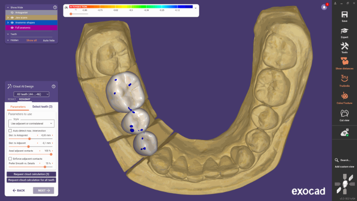 Il devient possible d’adapter en temps réel la morphologie occlusale sur plusieurs unités simultanément, apportant précision et rapidité lors de la conception de bridges et restaurations multiples.